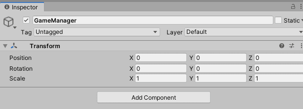 Erstelle im Hierarchiefenster ein Object, wähle mit der rechten Maustaste die Transformkomponente im Inspectorfenster und setze es auf Reset. Anschließend benenne das Objekt als GameManager.