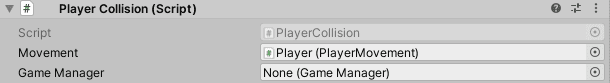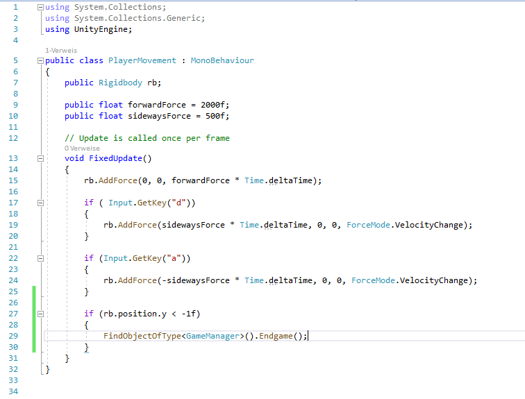 Die Voraussetzung wird im PlayerMovement-Script geschaffen. Wenn der Spieler auf einer Achse unter einem bestimmten Wert ist, wird Game Over angezeigt.