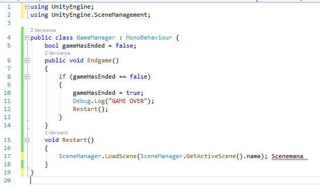 Ersetze Restart durch Invoke („Restart“) im GameManager-Script. Dahinter setzt du die Zeit, die vergehen soll, bis die Funktion „Restart“ aufgerufen wird.