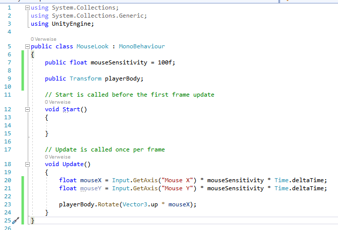 Du benötigst ein Script, dass dir ermöglicht, dich umzusehen. Alles wird mit der Maus bewegt und diese bewegt sich auf zwei Achsen (x und y). Bewegst du die Maus zur Seite, soll der Spieler sich auf der y-Achse rotieren. Bewegst du die Maus hoch oder runter, soll sich nicht deine Spielfigur bewegen, sondern nur die Kamera auf der x-Achse.