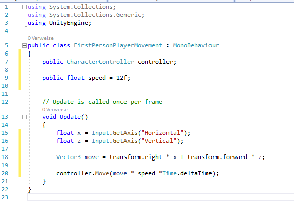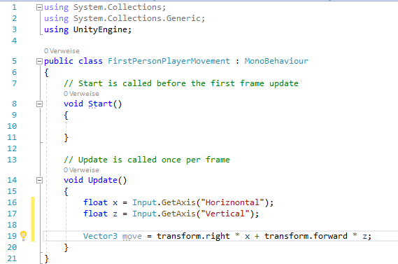 Als nächstes folgt die Spielerbewegung. Für die Spielerbewegung sind Eingaben notwendig. Die Eingaben sind für die horizontale und vertikale Achse nötig. Die Bewegungstasten, die in Unity vordefiniert sind, befinden sich auf der Tastatur und sind W, A, S und D.