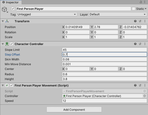 Um beispielsweise Treppen steigen zu können, ist es notwendig, den StepOffset des CharacterControllers zu steigern, wie z. B. auf 0.7