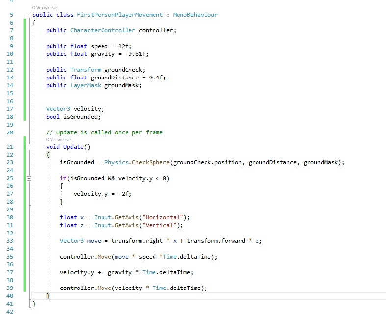 Erstellt wird beim neuen GameObject eine kleine unsichtbare Sphäre an einem festgelegten Punkt. Wenn sie mit etwas kollidiert, das sich in der GroundMask befindet ist der Spieler auf dem Boden. Ansonsten, ist es der Spieler nicht.