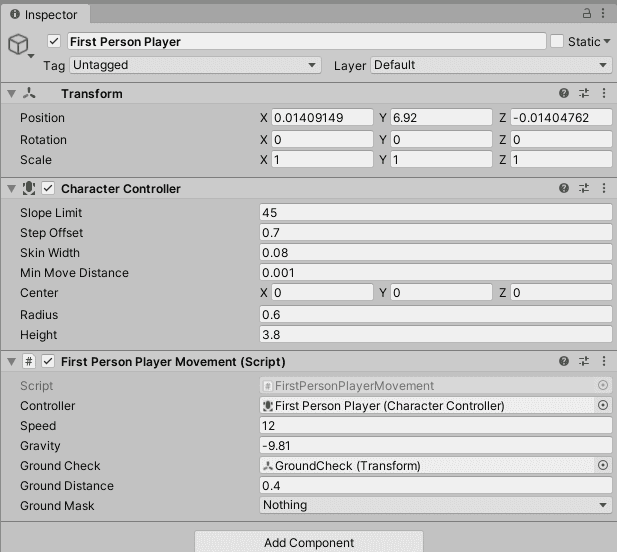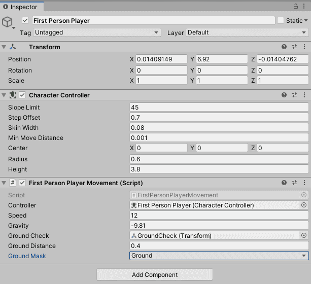 Erstelle ein leeres Objekt und ziehe es bei deinem Spieler nach unten und nenne es GroundCheck. Dieses Objekt nimmt einen Physikcheck vor, ob der Spieler auf dem Boden steht. Damit das Objekt diesen Check vornehmen kann, muss eine Verbindung im Script hergestellt werden.