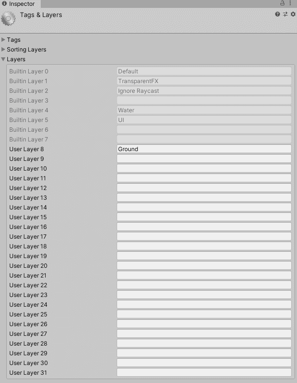 Füge bei der Ground Mask die Ebene bzw. für Layer ein. Du kannst auch neue Layers rechts oben neu definieren.