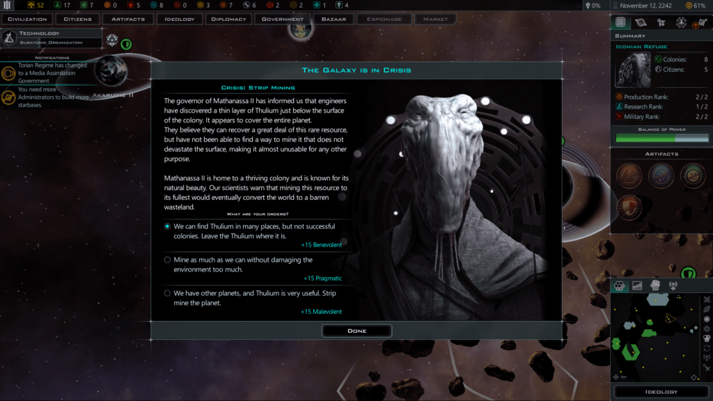 Du startest dein Spiel auf einer Heimaltwelt. Als Mensch beginnst du auf der Erde. Die Umgebung ist recht gastfreundlich, es gibt ein par Schiffe, einen Raumhafen und einen Sternkreuzer. Jeder Himmelskörper hat seine eigenen Anforderungen und verlangt andere Strategien. Relevant ist außerdem das Errichten von Gebäuden und die Lokalisierung, wo du sie baust. Auf einer Hex-Karte des Planeten wählst du den Standord aus. An manchen Stellen erhältst du Boni für Wirtschaftsgebäude oder Finanzenrichtungen oder Militärbereiche. Da nicht viel Platz zur Verfügung steht, musst du dich auf bestimmte Wirtschaftszweige konzentrieren.