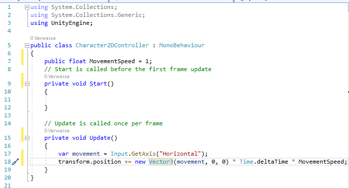 Die neue Position berechnet sich asu dem neuen Vektor 3 * Time.DeltaTime * Bewegungsgeschwindigkeit (MovementSpeed)
