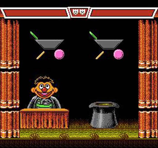 Das erste der beiden Spiele ist „Ernies Magic Shapes“. Du wählst verschieden Varianten aus, aber meistens funktioniert es so: Ernie steht hinter einem vorgehängten Schreibtisch auf der linken Seite des Bildschirms, während rechts ein riesiger Zylinder auf den Kopf gestellt ist. Über Ernie gibt es eine Form der einen oder anderen Farbe. Das Ziel ist es, diese Form (und in einigen Fällen auch die Farbe) mit einer beliebigen Anzahl von Formen abzugleichen, die rechts angezeigt werden. Alles, was du zu tun hast, ist dann die Taste ‚A‘ zu drücken, um zu bestätigen, dass du diese Form in den Hut stecken möchtest. Sobald du dies tust, bewegt Ernie seinen Zauberstab und die Form fällt ein. Wenn du richtig geraten hast, springt ein Kaninchen heraus und gibt dir das Daumen-hoch-Zeichen, bevor du die Übung wiederhol. Wenn du dich jedoch geirrt hast, schaut der Hase hinter dem Hut hervor und schüttelt entmutigend den Kopf . Dann können kannst du es erneut versuchen.