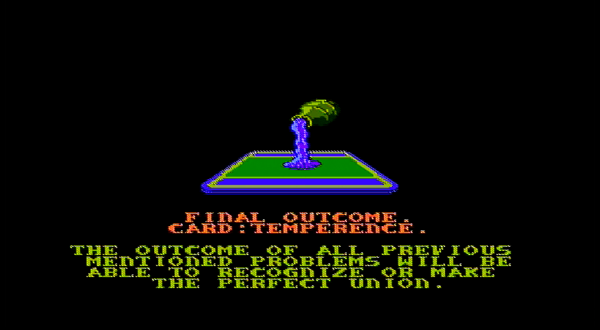 Die Grafik ist begrenzt, da keine wirklichen Aktionen stattfinden. Welche Grafiken im Spiel enthalten sind, ist geeignet und erledigt den Job, aber nichts Großartiges, selbst für ein NES-Spiel. Der Sound folgt hier dem gleichen Muster, er funktioniert für das Spiel, aber nichts Spektakuläres. Auch wenn sich das Spiel selbst möglicherweise eingeschränkt anfühlt, enthält das Spielhandbuch eine Fülle von Informationen zur Kunst der Tarotkarten. Das Handbuch geht auf die Geschichte der Tarotkarten ein, erklärt die Platzierung der Karten und spricht über die Bedeutung der Karten.