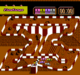 Super Off Road Racing oder Ivan ‚Ironman‘ Stewarts Super Off-Road ist ein Rennspiel, in dem du die Kontrolle über ein Miniatur-Offroad-Auto übernimmst und mit dem du Rennen mit drei weiteren Fahrern fährst, um das Rennen zu gewinnen. Wenn du das Spiel einschaltest, zeigt sich dir der blauäugige rote Helm mit Ivan Stewart, der dich angrinst, und die Fähigkeit, mit bis zu 4 Spielern zu spielen. Da die NES-Konsole über zwei Controller-Ports verfügt, benötigst du einen NES Four Score oder NES Satellite, um mit vier Controllern spielen zu können. Ihr wählt eure Nationalität, obwohl es keinen Unterschied zu geben scheint, welche Nationalität ausgewählt wird. Du kannst dein Fahrzeug nach jedem Rennen je nach Zielort anpassen , um Teile Ihres Fahrzeugs wie Reifen, Beschleunigung und Höchstgeschwindigkeit zu verbessern. Es gibt bis zu 6 Kategorien. Die Anpassung geschieht mit Geld, das du gewinnst, je nachdem, wo du das Rennen beendest. Es ist eine Pauschale für jedes Upgrade. Es scheint manchmal, dass du die Beschleunigung und die Höchstgeschwindigkeit verbesserst, aber im nächsten Rennen rast der Computer vorbei und du kannst sie nicht einholen, was frustrierend sein kann, da du dich möglicherweise mehr auf Turbos verlässt, die schnell ausgehen. Es kommt nicht oft vor, aber die Inkonsistenzen ist anstrengend.