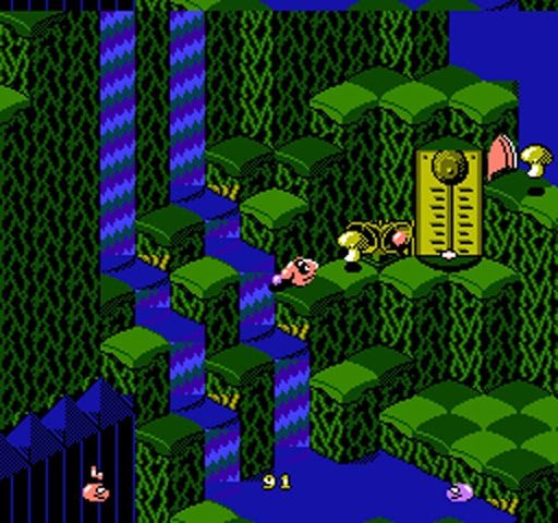 Zwei Schlangen, Rattle and Roll, sind auf einer Mission. In Snake, Rattle, ’n Roll scheint es keine Handlung zu geben. Du entscheidest dich, ob du alleine oder mit einem Freund im Koop-Zwei-Spieler-Modus spielen möchtest. Die blaue Schlange Roll darf nur spielen, wenn ein zweiter Spieler beschließt, das Spiel auszuprobieren. Du steuerst zu Beginn einen Schlangenkopf, dessen Ziel es ist, lebende Süßigkeiten zu finden und sie dann zu essen. Wenn du mehr und mehr dieser perfekt runden Leckereien verschlingst, wird dein Schwanz länger, bis das letzte Segment davon blinkt. In diesem Fall ist es Zeit, die Waage zu finden und darauf zu springen. Wenn du genug wiegst, läutet die Glocke und die Ausgangstür öffnet sich. Gleite durch diese Tür, um auf magische Weise das nächste Level zu betreten! Das ist Snake Rattle ’n Roll auf den Punkt gebracht, aber es ist nicht so einfach, in den nächsten Level zu gelangen.