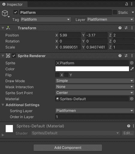Zuerst einmal benötigen wir einen Hintergrund bzw. eine Spielwelt, einen Charakter und etwas, worauf der Charakter stehen kann. Es zeigt sich mir das Problem, das der Hintergrund vor der Plattform liegt, die ich einbauen möchte. Ich weiß von früheren Projekten, das es etwas mit den Layers zu tun hat und das meine Plattform einen Collider benötigt, damit die Figur darauf stehen kann. Für die Figur benötige ich für die Bewegung ein PlayerMovemenscript.