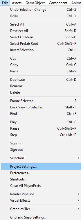 Wenn das VR SDK installiert ist, kannst du VR aktivieren. 1. Wähle in der Dropdown-Liste Bearbeiten die Option Projekteinstellungen.