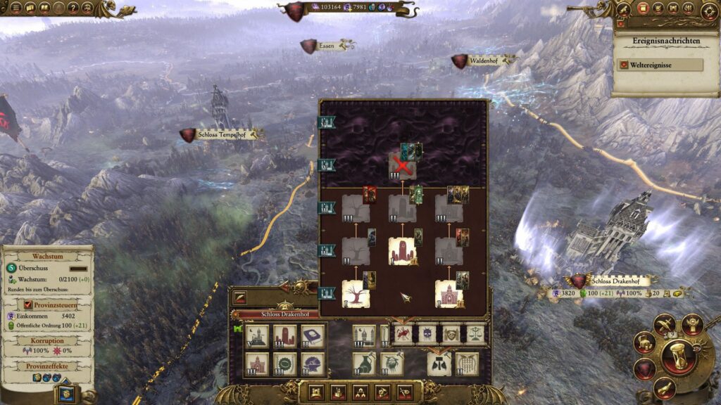 Zu Beginn der Kampagne wählst du einen von zwei legendären Helden. Dieser führt eine Fraktion an. Warhammer – Total War bietet Rollenspielelemente für diese, denn ihre Fähigkeiten lassen sich mit großen Fähigkeitsbäumen ausbauen. Vampire beispielsweise können Todesmagie oder Nekromanti lernen. Alternativ können Sie den Nahkampf treten. Zudem schalten sie zusätzliche Quests frei, die bei Erfüllung brauchbarer Items abwerfen.
