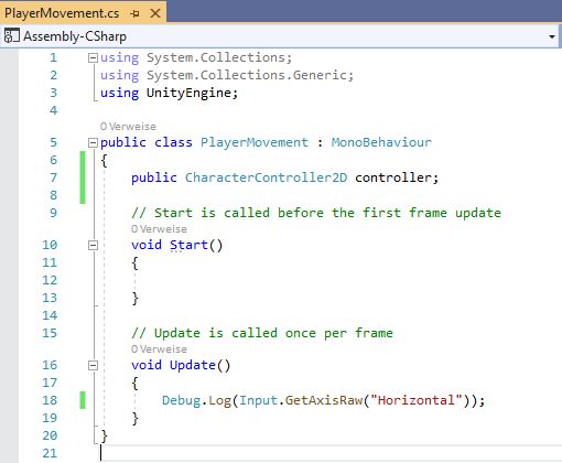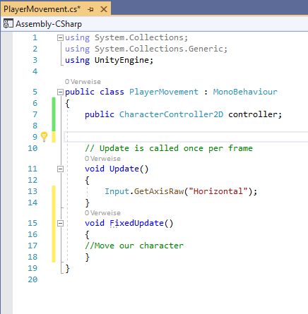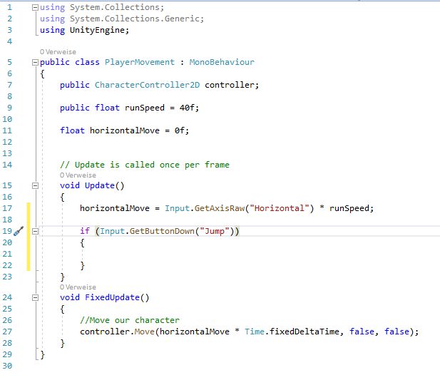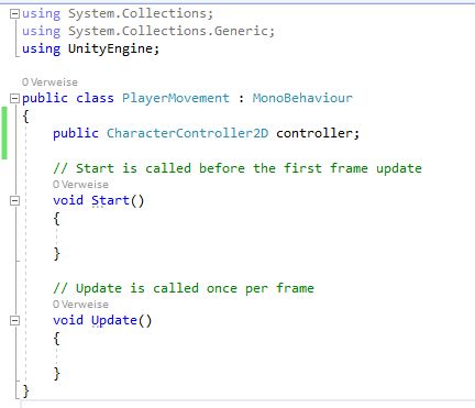 Zuerst wird eine Referenz vom PlayerMovement-Script zum Character Controller benötigt. Damit teilst du diese mit, was mit dem Charakter passieren soll.