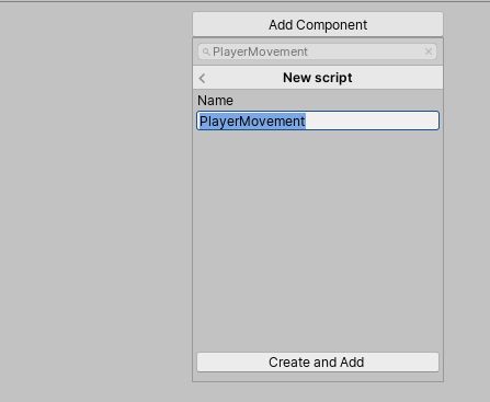 Gehe auf Add Component–> Geben PlayerMovement ein und wähle New Script sowie Create and Add.
