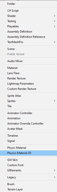 Wähle dafür im Projektfenster Create–>Physics Material 2D