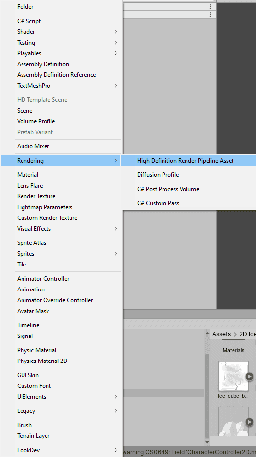 Erstelle ein neues HDRenderPipelineAsset, indem du in der Dropdown-Liste Assets die Option Erstellen> Rendern> High Definition Render Pipeline Asset auswählst.