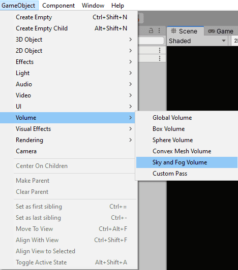 Um einer Szene volumetrischen Nebel hinzuzufügen, musst du ein globales Einstellungsvolumen hinzufügen. Ein globales Einstellungsvolumen ist ein GameObject, das in der Szene vorhanden ist und das Überschreiben bestimmter Szeneneinstellungen ermöglicht. Wenn deine Szene noch kein globales Einstellungsvolumen hat, füge ein neues hinzu. Navigieren in der oberen Leiste zu GameObject> Volume> Sky and Fog Volume.