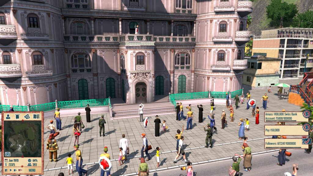 Für deine Exportwirtschaft benötigst du Eisenminen, Ölbohrtürme, Tabakfarmen und Bananenplantagen. Sie werfen das Geld für deine Bauvorhaben ab. Für deine Bewohner baust du Krankenhäuser, einen Platz zum Beten und Polizeistationen, damit sie sich sicher fühlen. Nicht so einfach ist dabei die Balance zwischen deinen Bauvorhaben und dem nahenden Bankrott. Zusätzlich erfüllst du die Bedürfnisse deiner Untertanen und rangierst mit den politischen Lagern. Wer seine Untertanen vernachlässigt, wird abgesetzt. Im Gegensatz zu den anderen Tropicospielen darfst du im vierten Teil Waren importieren.