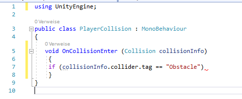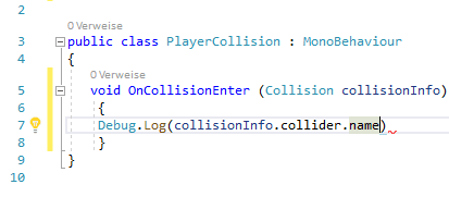 Alles was in den geschweiften Klammern steht, geschieht, wenn zwei Objekte kollidieren. Unity benötigt Informationen darüber, welches Objekt getroffen wird. Dafür nutzt du die runden Klammern. Trage „Collision“ ein und teile Unity mit, dass jetzt Informationen über die Collision kommen. Gebe diesem dann einen Namen.